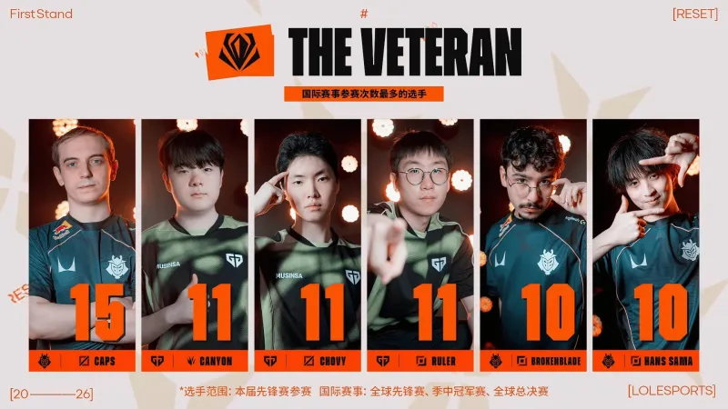 虎扑03月16日讯 BLG对阵BFX赛前官方放出一组数据,本次先锋赛10名选手首次参加国际赛事,而Caps以15次参加国际赛事领跑本次先锋赛,GEN的Canyon、Chovy、Ruler以11次并列第二。